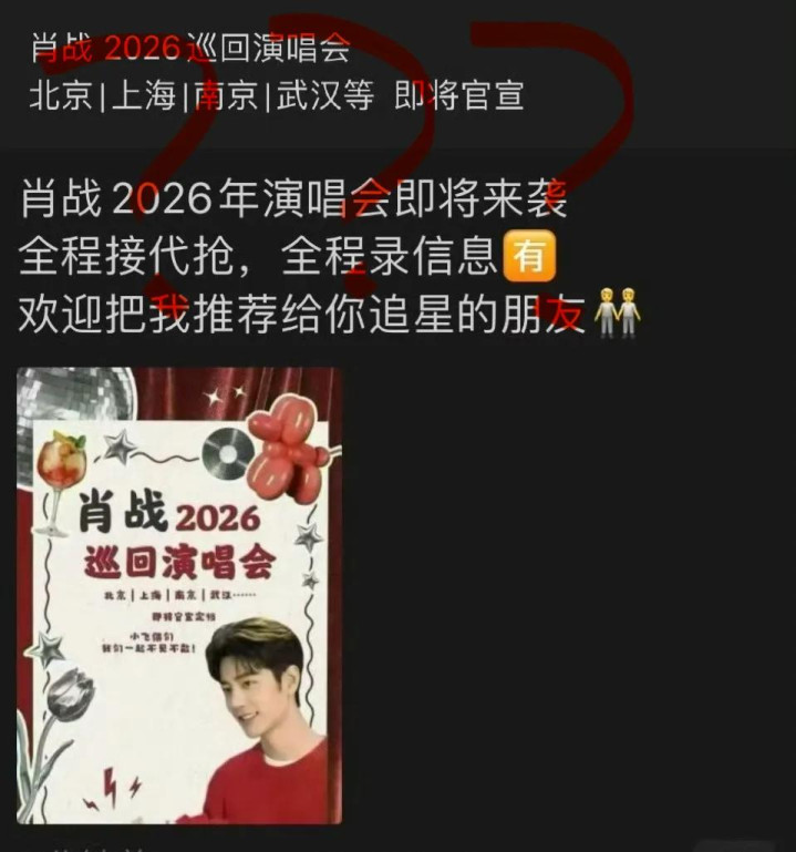 不知是否因为有黄牛发了“肖战2026年演唱会全程接代抢”在一又友圈,联系肖战2026年巡回演唱会的音问霎那间激励热议,冲上热搜高位。全网热议的网传信息娇傲,肖战或将在2026年举办个东谈主巡回演唱会,拟成立北京、上海、南京、武汉等主要城市集次,部分版块还说起重庆、杭州等城市。
