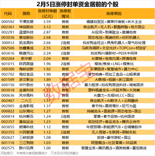 以封单金额贪图,平潭发展、神剑股份、遥看科技等涨停板封单资金最多,辞别有3.59亿元、3.12亿元、2.87亿元。从封单力度(封单量占流通A股比例)来看,凯龙高科、金富科技、韩建疆域等力度较大,辞别为10.85%、9.47%、7.73%。