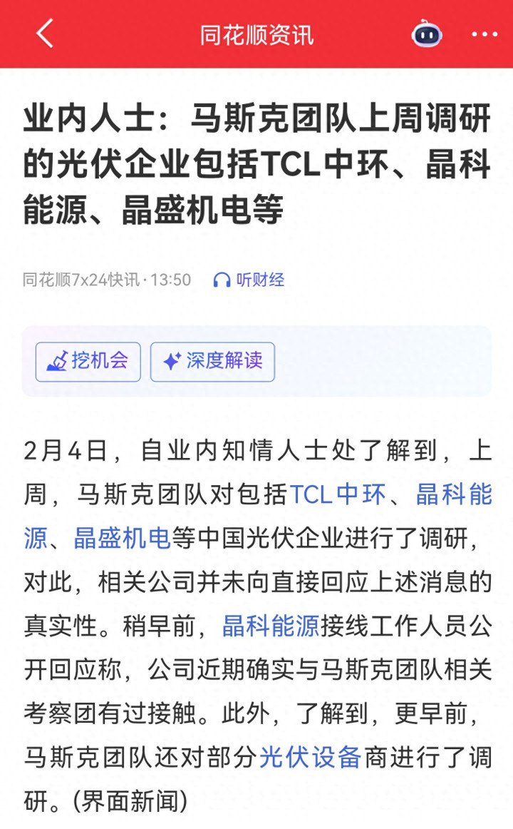 2月4日,一则马斯克团队到访晶科动力、TCL中环、晶盛机电等企业的音问在光伏行业掀翻山地风云。当日午后,晶科动力成绩20cm涨停,带动A股光伏板块集体走强。这场横跨中好意思科技界的产业互动,背后是马斯克“天际算力+天际光伏”的弘大蓝图与中国光伏产业阻止内卷的紧迫需求。