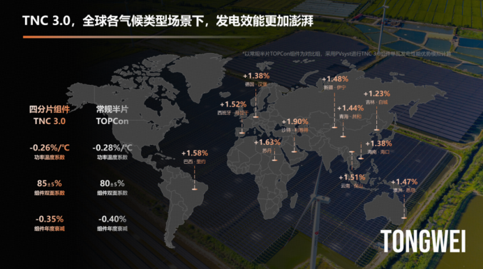 证实通威测算扫尾显现,TNC3.0的单瓦发电性能相较旧例半片TOPCon组件在在不同经纬、不同征象条目的行使场景中均有显耀上风,可进步系统发电量1.23%~1.90%。