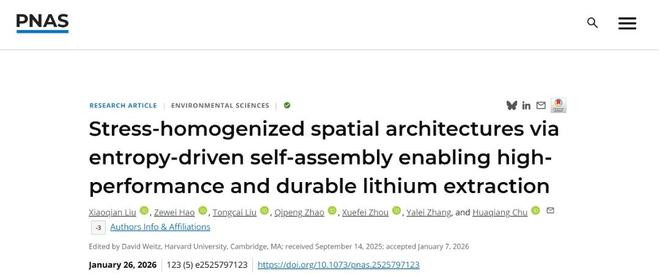 近日,海外巨擘学术期刊《好意思国科学院院刊》(proceedingsofthenationalacademyofsciencesoftheunitedstatesofamerica,pnas)在线发表了同济大学环境科学与工程学院张亚雷教会、褚华强教会团队的这一最新臆想效能,论文题为“stress-homogenizedspatialarchitecturesviaentropy-drivenself-assemblyenablinghigh-performanceanddurablelithiumextraction”(熵运行自拼装构筑应力均质化架构,兑现高效捏久锂提真金不怕火)。