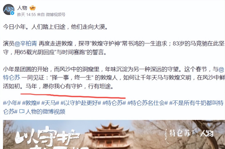 除此除外,小年今日,辛柏青还出镜了一部敦煌文化宣传片。