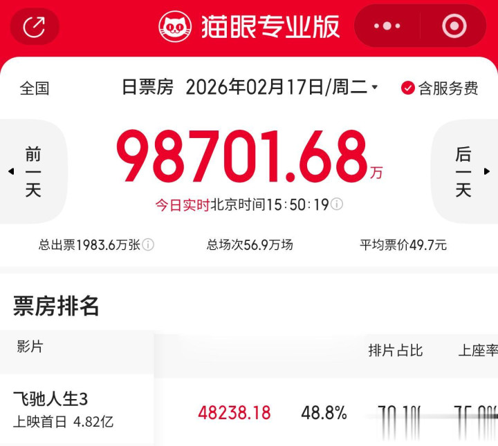 《驰骋东说念主生3》还是领跑春节档,及时票房4.85亿,今天预计破五亿了。难怪那么好,沈腾的不雅众缘太强了。