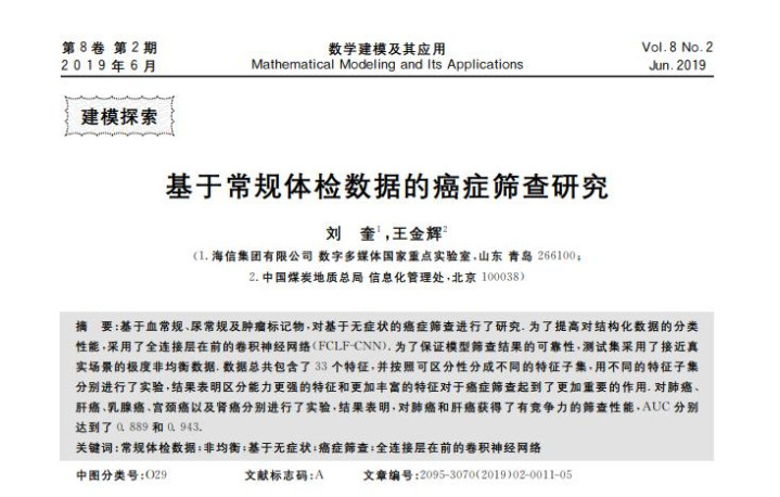 [1] 刘奎.基于惯例体检数据的癌症筛查接洽, 数学建模偏激欺诈, 2019-06-15