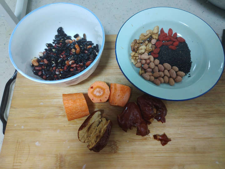 豆乳的食材照旧比拟丰富一些,用了四种红黑小豆,加了枸杞,黑芝麻、红枣、花生米、核桃仁、胡萝卜,打出来的豆乳也比拟浓。