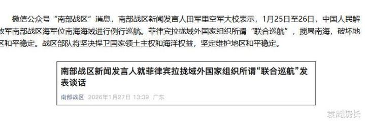 1月25日至26日,南部战区舟师在南海张开例行巡航任务。南部战区发言东谈主就明确点名菲律宾,称其拉拢域番邦度组织所谓的“勾通巡航”,意图搅局南海,窒碍地区和郑重固。
