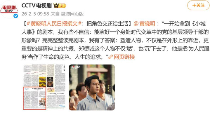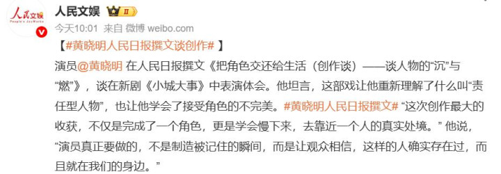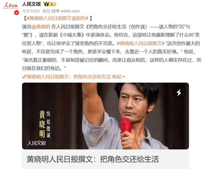 东说念主民文娱|黄晓明东说念主民日报撰文谈创作