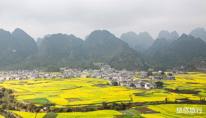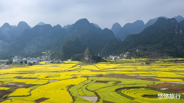 2月中旬-3月中旬,80 余万亩油菜花全面洞开,"金色波涛" 翻涌,与喀斯特峰林无缺交融。