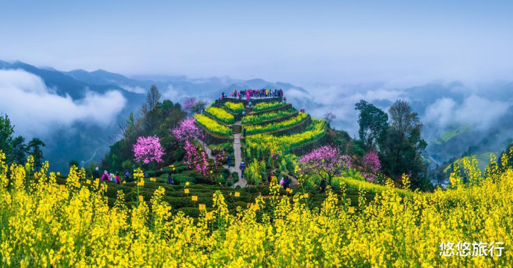 石潭村一年有200多天齐可以看到云海,3月初漫山的油菜花海在潸潸中乍明乍灭,桃花稀疏点缀。