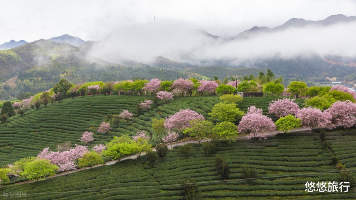 樱花沿着茶山梯田曲折,像给青山系了粉色丝带,早晨的薄雾飘在花间,走两步就能闻到茶香混开花香,深呼吸齐是春天的滋味。