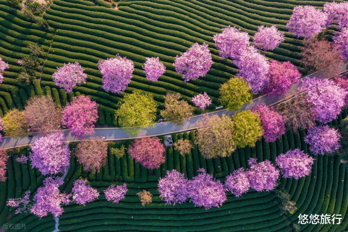 龙岩漳平市永福镇,5万多亩茶园中种着数万多株不同品种的樱花,花期从1月末捏续到3月,2月下旬最好意思。可遴荐不同的樱花茶园不雅赏。