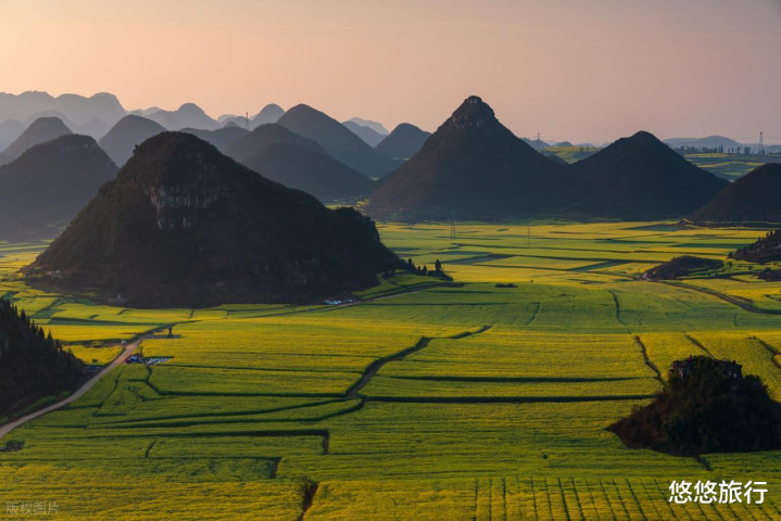 金鸡峰丛俯视油菜花海和峰林,早晨潸潸缭绕时如瑶池。牛街螺丝田独有的 "地面指纹" 造型,青黄交汇。九龙瀑布群视线生动,可见花海与瀑布同框。