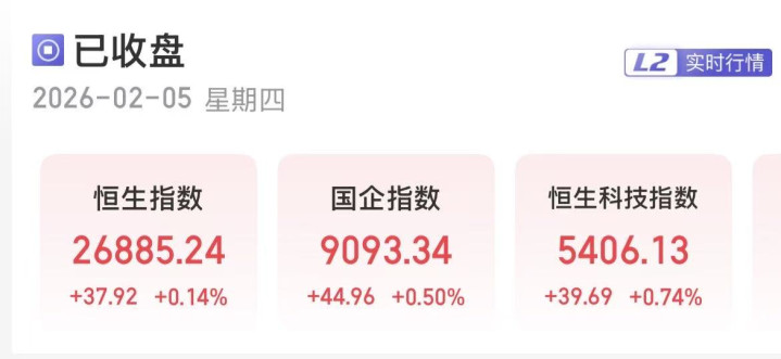 上证报中国证券网讯(刘禹希记者严晓菲)2月5日,港股三大指数飘红。死心收盘,恒生指数涨0.14%,报26885.24点;恒生国企指数涨0.5%,报9093.34点;恒生科技指数涨0.74%,报5406.13点。