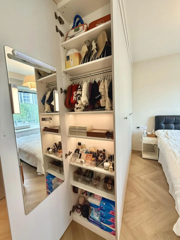 不如在衣柜侧面,酌量出20cm的厚度,作念一个超薄化妆柜。