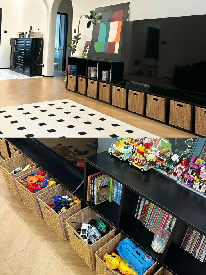 有娃的家,客厅的玩物长期是乱的,光靠你打理,累死也没用。