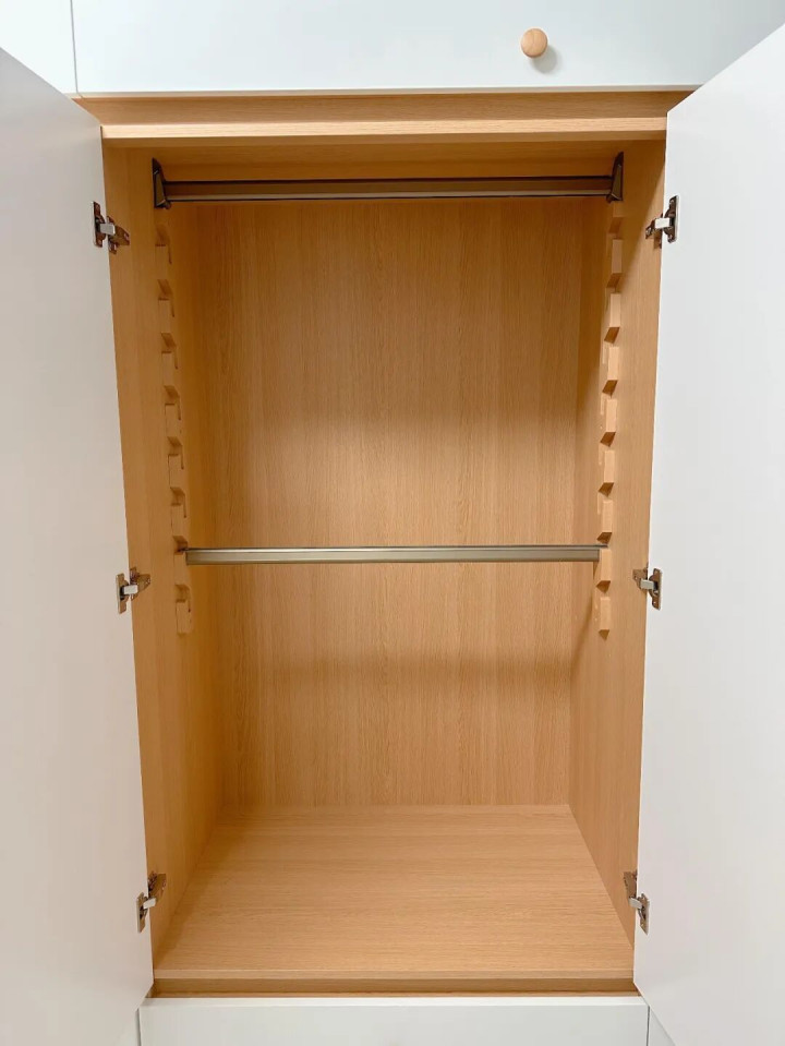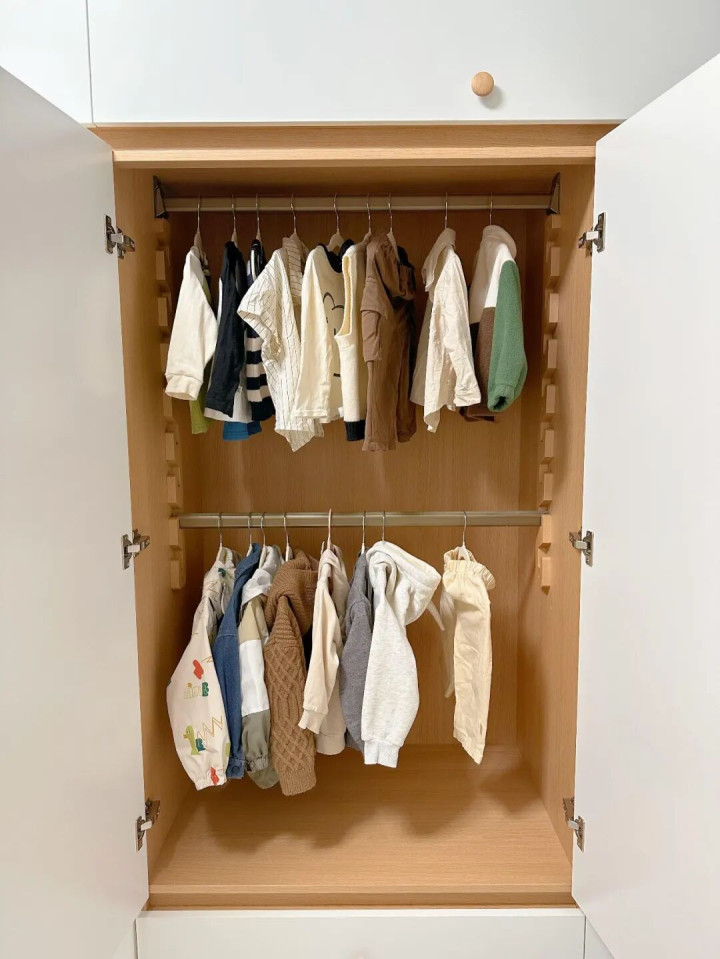 这样,一个衣柜的容量能提高30%以上,何况跟着孩子长高,衣柜也能有长挂衣区。