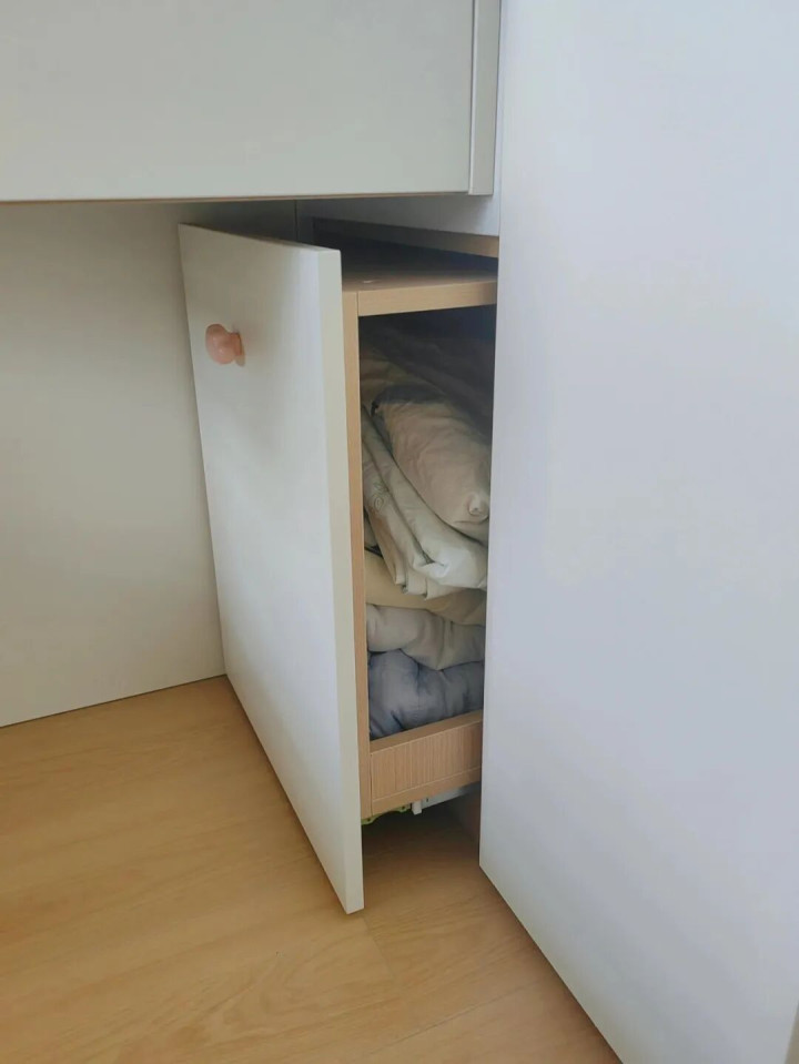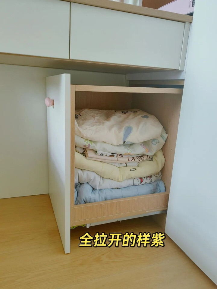也不错放书,放孩子的书包啥的,关于小卧室或榻榻米房间,这种抽拉缱绻简直挺实用,拿取时一拉即出来了,毋庸通盘东谈主爬进去。