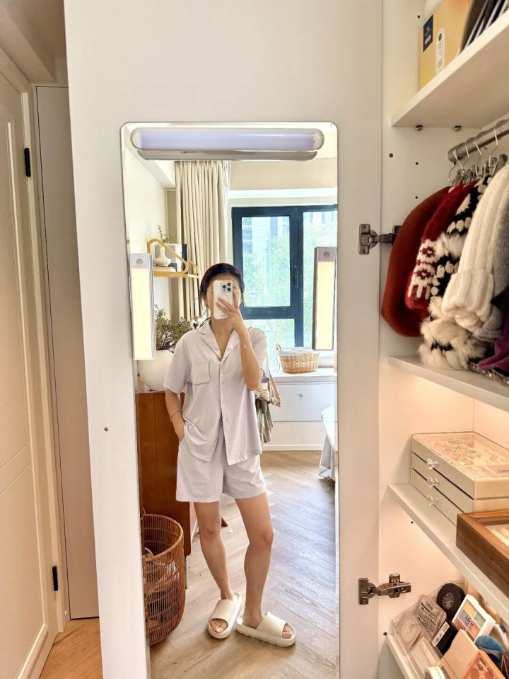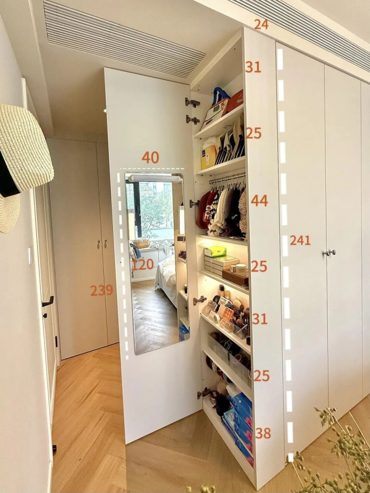 柜门内部贴镜子,层板凭证你护肤品的高度来调度。这里即是你的“秀好意思加油站”,站着化妆,光芒还好。