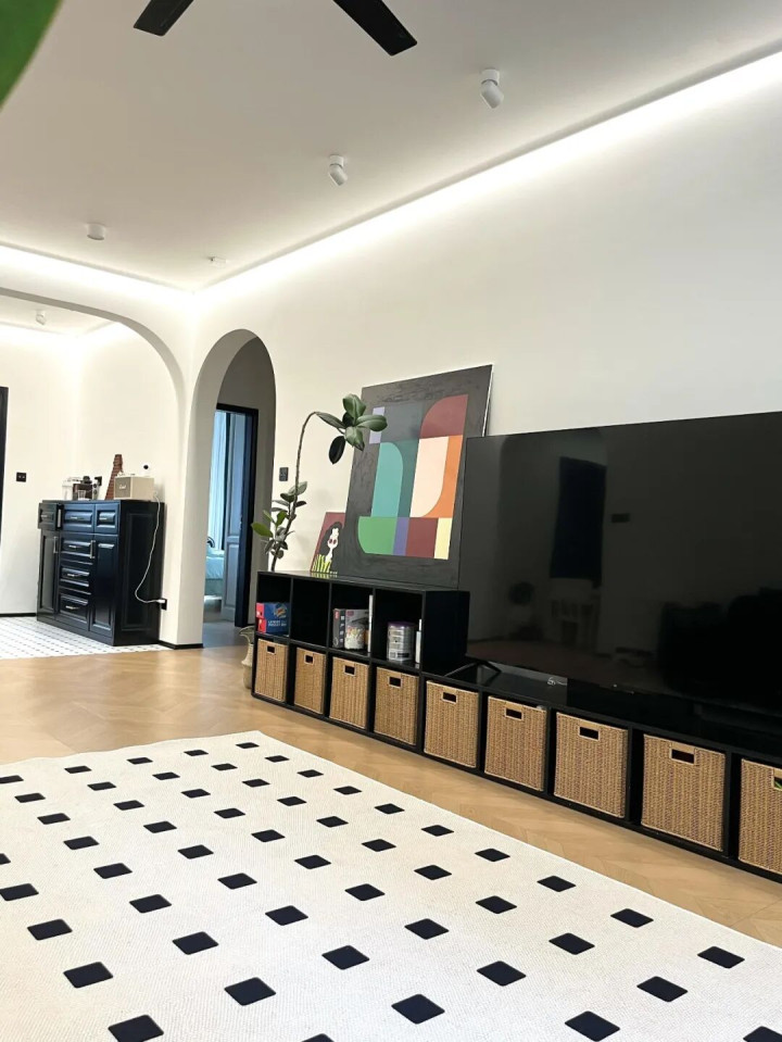 在电视柜底下,有意留出一溜空格,塞进去几个好像的藤编筐。