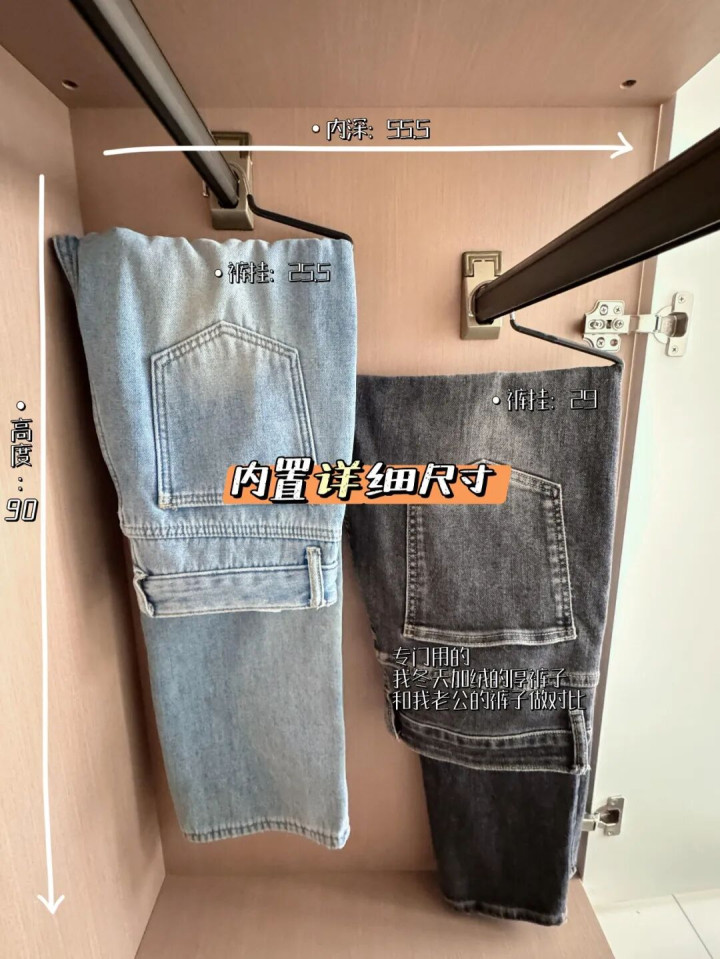 不错用双排裤架,衣柜净深55.5cm就够了,错位安装,一个挂杆的位置,能前后挂两排裤子。