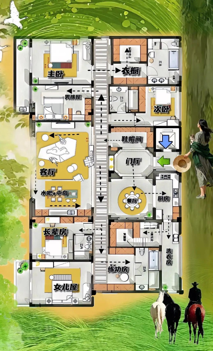 不得不佩服,四平门厅,一口仙气点化,超等大户型,400㎡魄力大,端起来,布局秩序井然,动线亦然顶礼跪拜,三条干线不模棱两可!