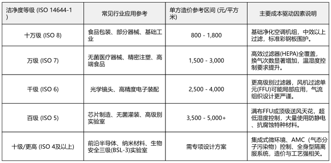 要紧身分是影响单方造价的洁净度等第,等第进步即意味着,需要包含如HEPA或ULPA这类更高效的过滤器,需要更大的送风换气次数,需要更精密的温湿度限度,还需要更严格的密封工艺,老本会呈指数级增长,底下诠释的是字据森培环境连年来的形势数据所整理的造价参考区间: