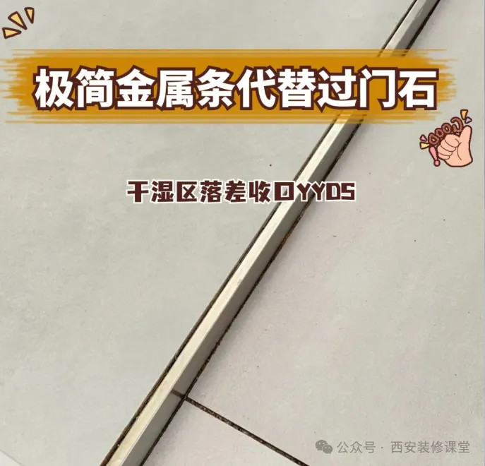 142.卫生间不要过门石作念凹凸台,一定让瓦工进场先打红外线看防盗门门槛是否舒服条款。凹凸台除过海棠角除外一定要有不锈钢收口条,后期绷瓷无法维修。