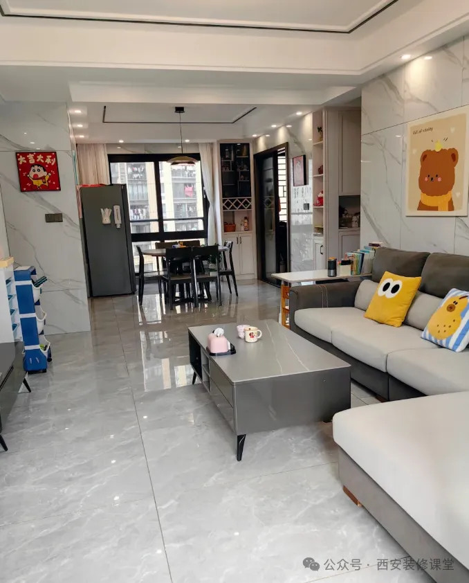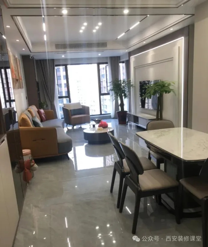 40.客厅大地不要跟风作念大规格瓷砖,除非你根本不琢磨装修预算,预算相配充足。不然前期硬装用钱,后期最伏击的产品和软配预算不及,最终后果如故廉价感。经受800*800规格柔光瓷砖或者木纹砖,后期同色好意思缝最实惠。