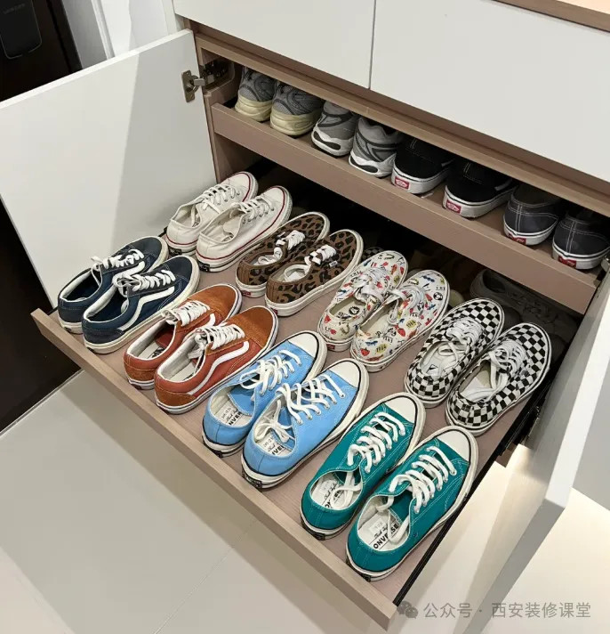 9.若是鞋柜进深太深,放鞋位置作念成抽拉板,就不错舒服太深鞋柜的收纳。