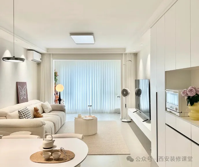 38.预算不充足的时间,客厅不作念莫得功能性和标的性的吊顶造型,不然就会变成建材堆积,后期预算不及。