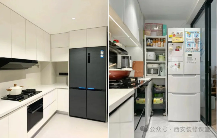 83.厨房若是放雪柜一定要零嵌入经受高柜严丝合缝去作念,千万不要前期舍不得定制,雪柜突兀放厨房,后期买一些破碎的收纳好物,合座会愈加凌乱。