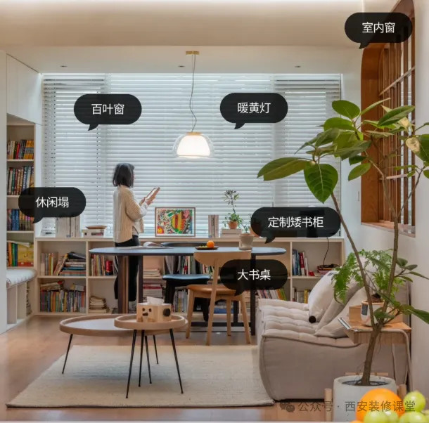 66.书斋若是耐久不睡东说念主,不要作念负担的布帘,百叶帘或者纱帘保证采光,还不错放大空间