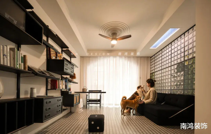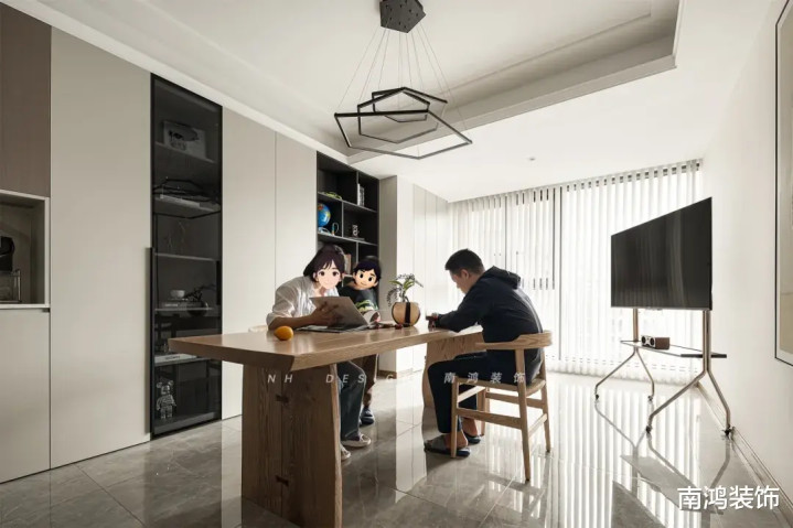使用书墙、长桌、模块沙发、投影等元素替代传统三件套,让客厅更适配我方的糊口节拍。
