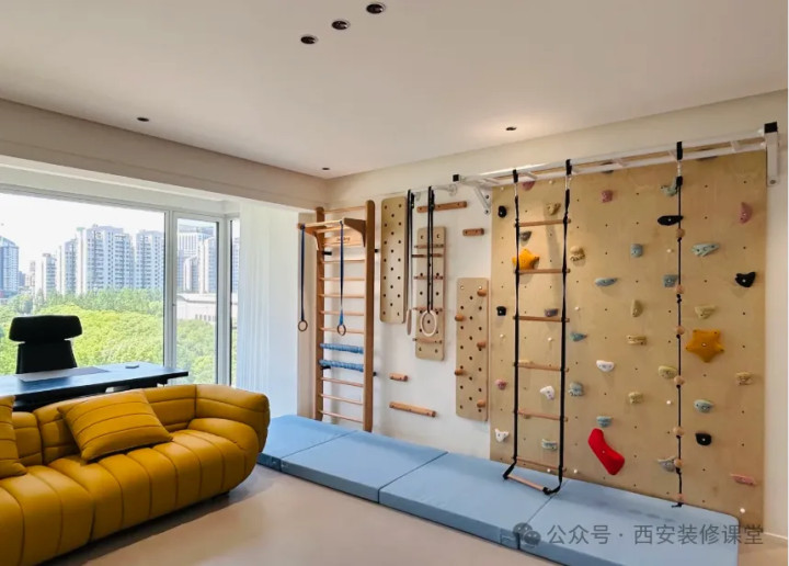 不要电视墙,不要电视,沙发反传统布局以后,哄骗电视墙给孩子完毕一个攀岩墙以及平时不错作为考验的功能墙。