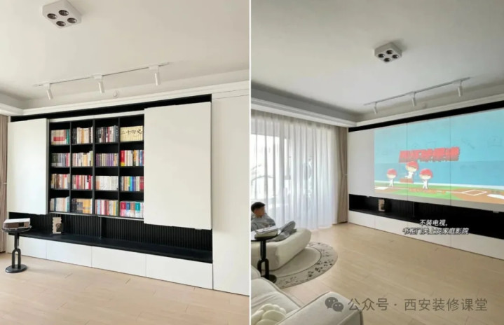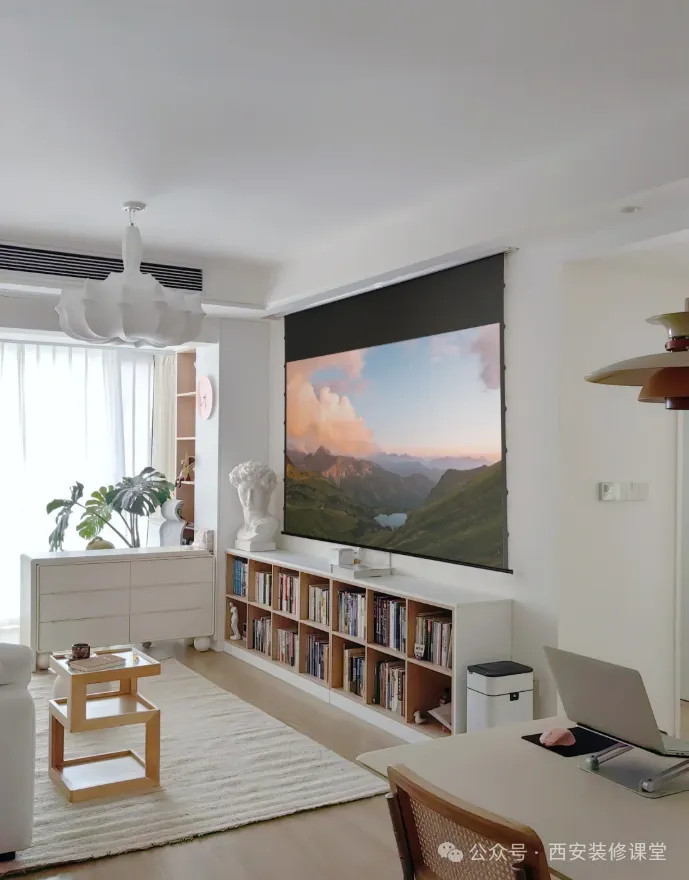 若是竹素莫得那么多,也不错遴荐矮书橱知足竹素收纳,同期上方避讳投影幕布,完毕偶尔的文娱。