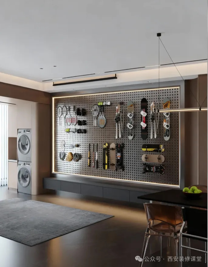 不要电视,电视墙也不需要那么多收纳柜,遴荐金属洞洞板,知足了健身器材的收纳,成了沿途亮丽的表象。