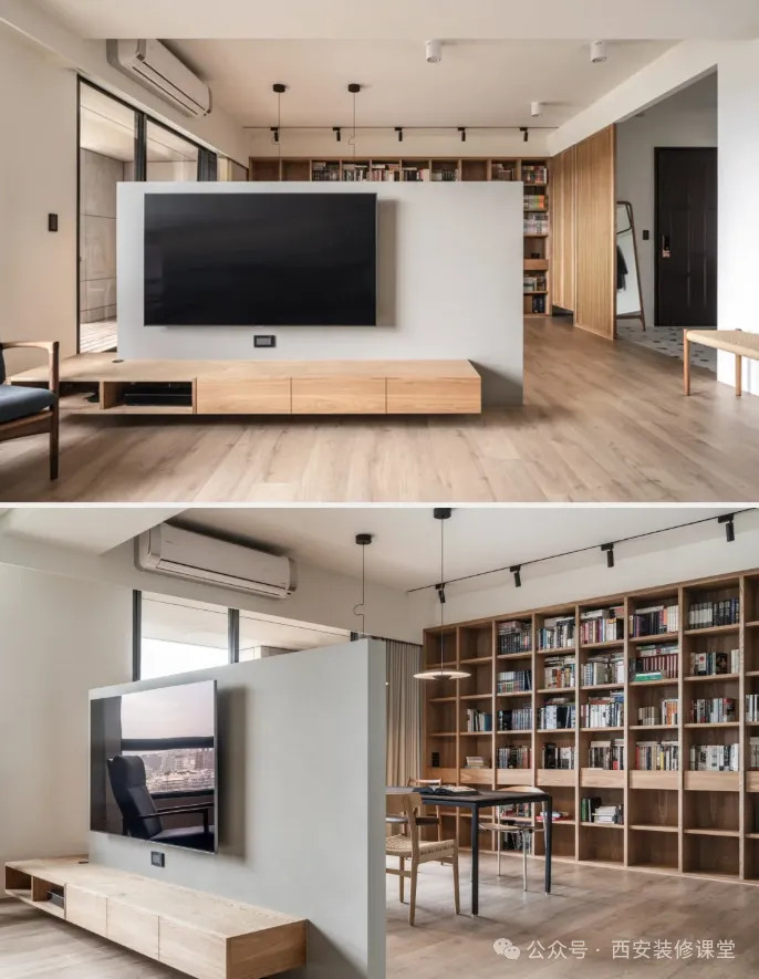 若是家里典籍好多,电视墙就不错满墙书橱的作念法,知足收纳,同期不要电视。