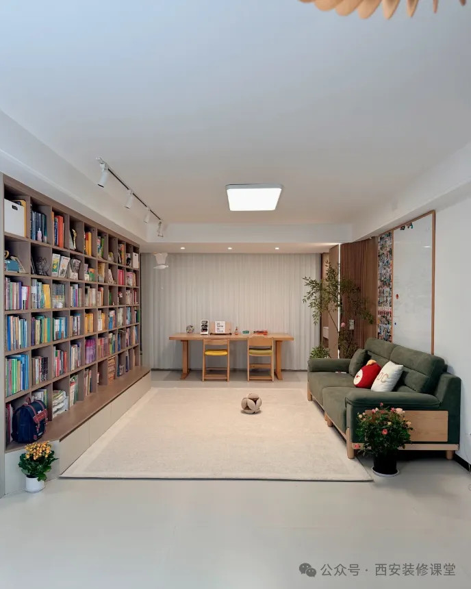不要电视,不作念配景墙,遴荐矮书橱完毕竹素的收纳,上方避讳幕布完毕偶尔的文娱。