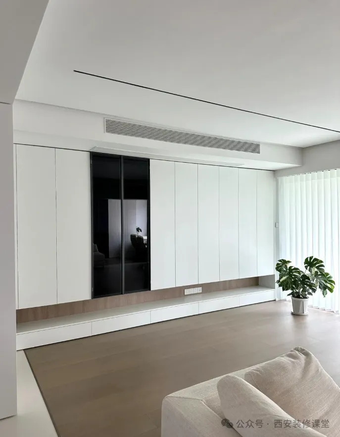 不需要电视,电视墙满墙柜知足基本的收纳,空间上更极简高档。